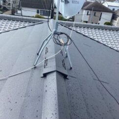 新たな屋根材を葺いてまいります。今回は「ガルバリウム鋼板」という金属屋根で耐久性も非常に高く、場合によっては40年以上の耐久性がございます。また、コンクリート瓦に比べるとかなり軽量な素材ですので安全性という面でもかなりの効果が期待できます。