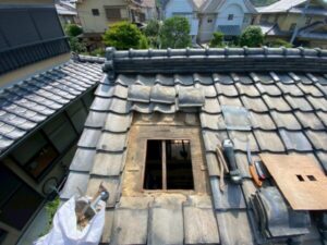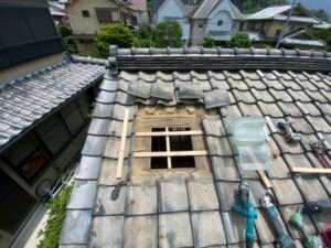 まずは瓦屋根の一部を撤去し、下地補強を行ったうえでガラス瓦を設置していきます。
