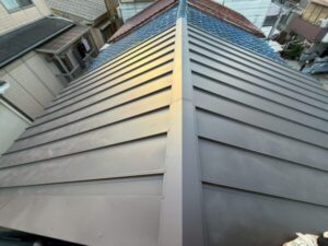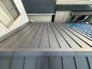 また、勾配が緩い屋根でしたので、雨水が屋根の外に流れやすいように立平葺きで行いました。