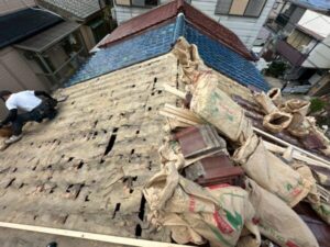 現場に伺うと、既存の瓦屋根の状態がひどくかなり雨漏りも発生していましたので、屋根の下地材まで雨水の影響で腐食していました。