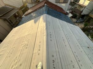 下地材の上から新たな屋根材を葺いてまいります。今回は「ガルバリウム鋼板」という金属屋根を葺きました。金属屋根ですので当然瓦と比べるとかなり軽量ですので、耐震性の向上も期待できます。