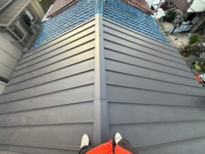下地材の上から新たな屋根材を葺いてまいります。今回は「ガルバリウム鋼板」という金属屋根を葺きました。金属屋根ですので当然瓦と比べるとかなり軽量ですので、耐震性の向上も期待できます。