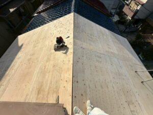 今回は新たに野地板と言う屋根材を固定するための、下地材と屋根を雨漏りから守るために雨水を屋根の外に逃がすルーフィングを設置致しました。