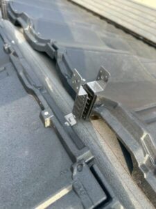 また、右側の画像にありますがステンレス製の棟補強金具も使用し地震などの揺れにも対応できるように補強いたしました。
