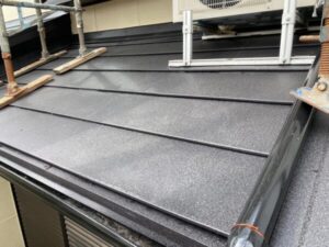 ルーフィングの上から新たな屋根材を葺いてまいります。今回は「スーパーガルテクト」という金属製の屋根材を使用いたしました。スーパーガルテクトは耐久性も強く、耐用年数も25年以上と言われています。また、最長25年の保証もついていますので施工後安心してお過ごしいただくことが出来ます。