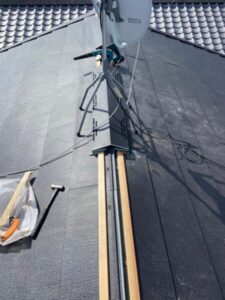 屋根を葺いた後、頂上部分にはどうしても隙間が出来てしまいますので、その隙間を塞ぐために棟板金を設置致します。棟板金を設置することで雨漏りなどを塞ぐ機能面でもちろん向上し、外観も一気に締まりますので、美しく見えます。