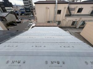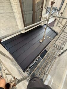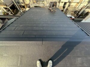 防水シートの上から新たな屋根材「スーパーガルテクト」を葺いてまいります。お客様のご要望で軽量かつ耐久性が長いものとのことでしたので、こちらの屋根材を使用いたしました。