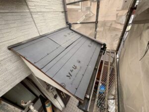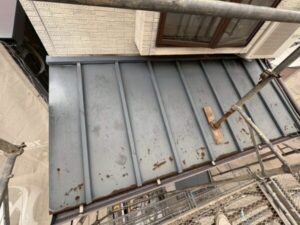 こちらが施工前になります。一枚目は大屋根部分で瓦を使用されていましたが、下屋根という一階部分の屋根には金属屋根を使用されていました。下屋根部分の屋根材はご覧のように錆が広がっている状態でございました。