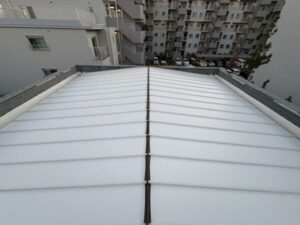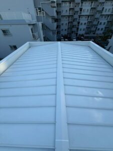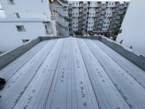下地材の上から新たな屋根材を葺いてまいります。金属材の立平葺きの屋根材を使用いたしました。こちらの屋根はあまり勾配がありませんでしたので、勾配が緩くても雨水が屋根に留まらず屋根の外に流れ落ちるように立平葺きの屋根材を使用いたしました。