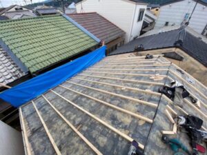 瓦を撤去し既存の下地材の上に垂木という棒状の木材を設置致します。