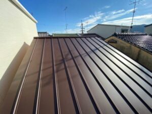 防水シートの上から新たに「ガルバリウム鋼板」という屋根材を葺いてまいります。こちらの屋根材は軽量かつ耐震性が高く、耐用年数も25年以上の耐久性を持ち、優れた屋根材になります。