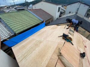 先ず野地板と言われる木材を設置致します。こちらは屋根全体の強度や耐久性を高める役割がございます。