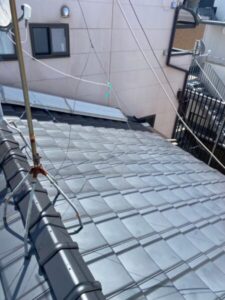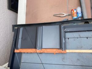 防水シートの上から新たな屋根材を葺いてまいります。今回は平板瓦という屋根材を使用いたしました。凹凸の少ない比較的フラットな屋根材になります。瓦という表現ですがかなり軽量でありながら耐久性も高く、非常にバランスの取れた屋根材になります。